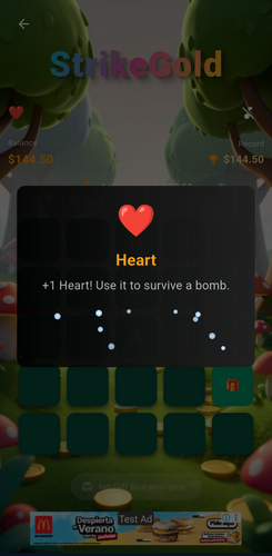 Tap on tiles to reveal gold and multiply your winnings. But beware — one wrong tap on a mine could cost you everything... unless you have a Heart to save you!